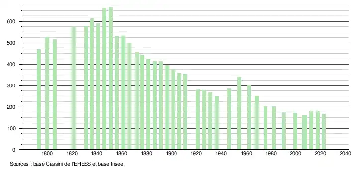 L'évolution du nombre d'habitants est connue à travers les recensements de la population effectués dans la commune depuis 1793. Pour les communes de moins de 10 000 habitants, une enquête de recensement portant sur toute la population est réalisée tous les cinq ans, les populations de référence des années intermédiaires étant quant à elles estimées par interpolation ou extrapolation[13]. Pour la commune, le premier recensement exhaustif entrant dans le cadre du nouveau dispositif a été réalisé en 2007[14].