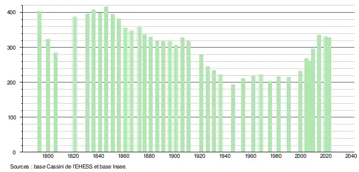 - ↑ Fiches Insee - Populations de référence de la commune pour les années 2006, 2007, 2008, 2009, 2010, 2011, 2012, 2013, 2014, 2015, 2016, 2017, 2018, 2019, 2020, 2021 et 2022.