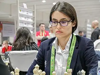 Ghazal Hakimifard joue pour l'Iran lors des olympiades d'échecs féminins[5] :