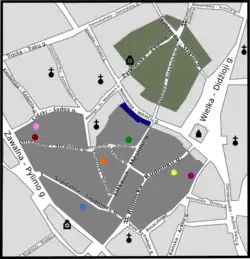 La zone désignée pour le ghetto est l'ancien quartier juif au centre de la ville. Alors que Vilnius n'a jamais eu de ghetto en soi, à l'exception de restrictions très limitées sur le mouvement et l'installation des Juifs au Moyen Âge, la zone choisie par les nazis pour leur ghetto est principalement et historiquement habitée par des Juifs. Les nazis ont divisé le secteur en deux quartiers juifs (grand ghetto et petit ghetto)[11], avec un couloir « non-ghetto » descendant la rue Deutschegasse (Niemiecka ou Vokiečių) qui les séparent.