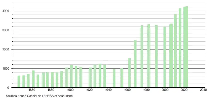 L'évolution du nombre d'habitants est connue à travers les recensements de la population effectués dans la commune depuis 1846. Pour les communes de moins de 10 000 habitants, une enquête de recensement portant sur toute la population est réalisée tous les cinq ans, les populations de référence des années intermédiaires étant quant à elles estimées par interpolation ou extrapolation[12]. Pour la commune, le premier recensement exhaustif entrant dans le cadre du nouveau dispositif a été réalisé en 2005[13].