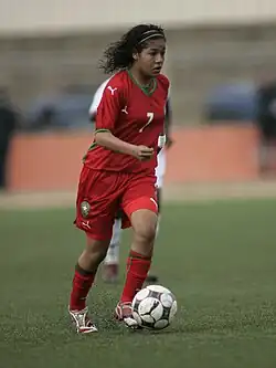 Elle dispute son premier match international le à l'occasion d'une rencontre amicale face à la France à Casablanca, dans le cadre des festivités du premier anniversaire de Lalla Khadija et de la journée mondiale de la femme (défaite marocaine, 6-0). Elle est d'ailleurs titularisée lors de ce match par Abdelkbir Slimani Alaoui, sélectionneur du Maroc à cette période[35]. C'est également la première fois que l'équipe de France dispute un match sur le continent africain[36].