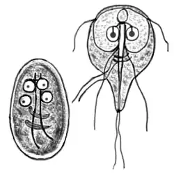 La forme végétative, le trophozoïte, mesure 15 μm. Elle se présente sous la forme d'un cerf-volant vue de face et sous la forme d'une cuillère vue de profil. Elle possède un noyau bilobé ainsi que huit flagelles, tous dirigés vers l'arrière : une paire antérieure, une paire postérieure et deux paires médianes. Ces flagelles partent de deux blépharoplastes (corpuscules) situés entre les noyaux et traversent l'axe de la cellule formant l'axostyle. Un ou deux corps parabasaux en virgule sont parfois visibles à la partie moyenne de la cellule.
