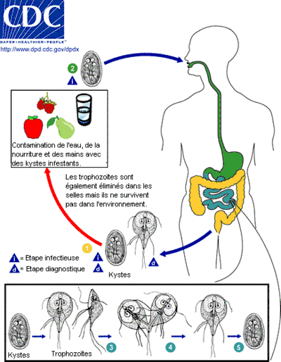 Le cycle parasitaire commence par un kyste non infestant éliminé dans les selles d’un individu infecté. Une fois dans l’environnement extérieur, le kyste devient infestant. Un caractère distinctif du kyste est qu’il possède 4 noyaux et un cytoplasme rétracté. Une fois ingéré par l’hôte, le trophozoïte arrive à un stade actif et il est capable de se mouvoir pour trouver sa nourriture. Il se nourrit aux dépens de la muqueuse à l’intérieur du tractus digestif et provoque chez l’hôte des douleurs épigastriques, une distension gazeuse excessive, une diarrhée graisseuse avec du mucus mais pas de sang. Ces symptômes peuvent durer 2 à 4 semaines mais pour un individu intolérant au lactose, les troubles peuvent persister jusqu’à six mois. Après l’étape de prolifération, le trophozoïte subit la phase de reproduction asexuée par scissiparité. Les trophozoites et les kystes résultants de la division traversent alors le système digestif et sont éliminés dans les selles. Les caractères distinctifs des trophozoïtes sont de grands caryosomes et le manque de chromatine périphérique, donnant aux deux noyaux l’aspect d’un halo. C’est une forme primitive de protozoaires à laquelle font également défaut les mitochondries.