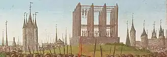 Sur cette base reposaient seize piliers carrés d'une dizaine de mètres de haut (32 ou 33 pieds). La dernière description du monument, qui a été publiée en 1724 mais peut-être très antérieure, indique que les piliers étaient répartis sur le pourtour du socle, cinq alignés sur le côté droit, cinq sur le côté gauche, et six le long du bord du fond[12], mais la peinture qu'en fait aux alentours de 1460 Jean Fouquet, qui a vraisemblablement suivi durant sa jeunesse une partie de sa formation dans un atelier parisien, montre qu'à cette époque les piliers, déjà très hauts, occupaient toute la surface du socle, en quatre rangées de quatre[14]. Chaque pilier était fait de 32 ou 33 pierres de grès[12]. Par leurs sommets, ils étaient reliés entre eux par des poutres de traverse en bois. Chaque sommet de pilier était couronné d'un chaperon[12], qui évitait l'infiltration de la pluie. Dans chaque chaperon étaient insérées les extrémités de deux poutres[12]. Les seize piliers correspondaient aux seize quartiers de Paris[12] instaurés à la fin du XIVe siècle.
