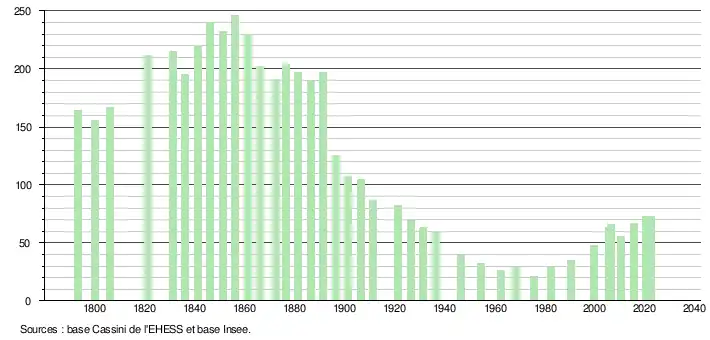 L'évolution du nombre d'habitants est connue à travers les recensements de la population effectués dans la commune depuis 1793. Pour les communes de moins de 10 000 habitants, une enquête de recensement portant sur toute la population est réalisée tous les cinq ans, les populations de référence des années intermédiaires étant quant à elles estimées par interpolation ou extrapolation[22]. Pour la commune, le premier recensement exhaustif entrant dans le cadre du nouveau dispositif a été réalisé en 2005[23].