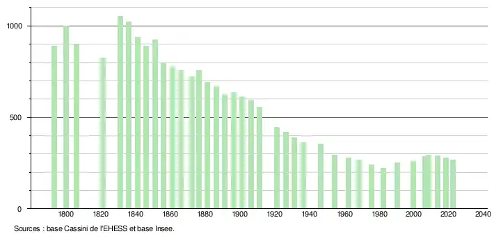 L'évolution du nombre d'habitants est connue à travers les recensements de la population effectués dans la commune depuis 1793. Pour les communes de moins de 10 000 habitants, une enquête de recensement portant sur toute la population est réalisée tous les cinq ans, les populations de référence des années intermédiaires étant quant à elles estimées par interpolation ou extrapolation[18]. Pour la commune, le premier recensement exhaustif entrant dans le cadre du nouveau dispositif a été réalisé en 2008[19].
