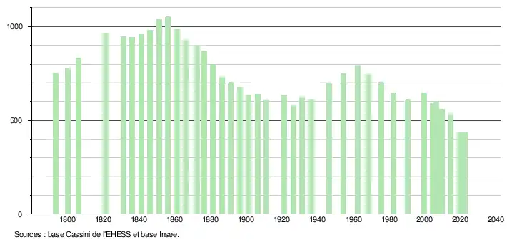 L'évolution du nombre d'habitants est connue à travers les recensements de la population effectués dans la commune depuis 1793. Pour les communes de moins de 10 000 habitants, une enquête de recensement portant sur toute la population est réalisée tous les cinq ans, les populations de référence des années intermédiaires étant quant à elles estimées par interpolation ou extrapolation[31]. Pour la commune, le premier recensement exhaustif entrant dans le cadre du nouveau dispositif a été réalisé en 2004[32].