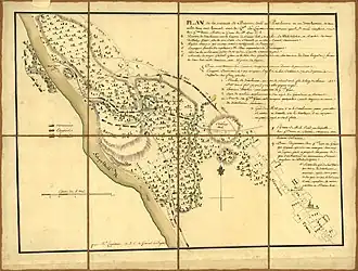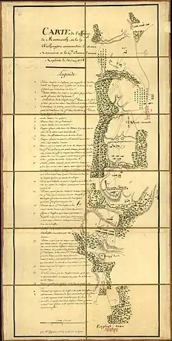 La première bataille à laquelle participe La Fayette a lieu à Brandywine le 11 septembre 1777[31]. Le général britannique William Howe, projetant d'attaquer Philadelphie, prévoit de faire arriver ses troupes du sud, par la baie de Chesapeake, plutôt que par la baie de la Delaware fortement défendue[32].