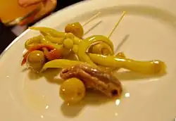 Cette présentation est marinée dans une solution de sel (saumurage), et se sert combinée avec des cornichons, des olives et un guindilla[1], parfois aussi un petit oignon, avec une conserve de poisson, généralement un anchois, unis par une pique. Actuellement, les entreprises de conserves et salaisons les distribuent généralement déjà prêtes.