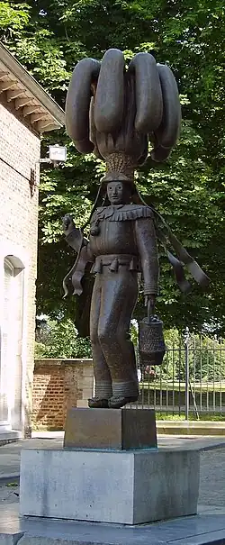 - Le costume proprement dit se compose d'une blouse et d'un pantalon, tous deux confectionnés dans de la toile de lin. Ce costume est orné de 150 motifs (vingt lions héraldiques, blasons, couronnes, étoiles, drapeaux), de bande feutrée ainsi que d'un masque d'Arlequin[8]. Ces ornements sont découpés dans de la feutrine de couleurs noire, jaune et rouge, couleurs du drapeau belge. Certains de ces ornements demandent jusqu'à quatre applications successives. La blouse est remplie de paille qui forme les « bosses » à l'avant et à l'arrière[6].