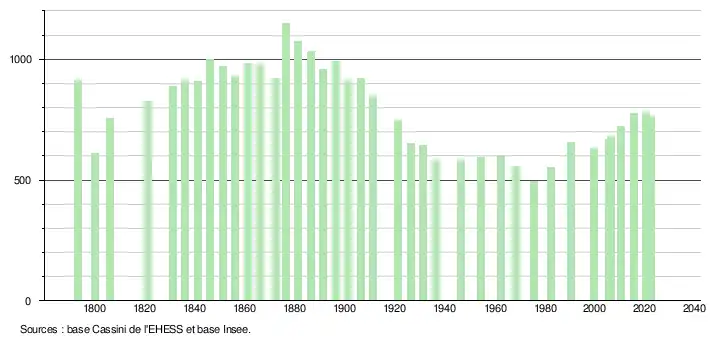 L'évolution du nombre d'habitants est connue à travers les recensements de la population effectués dans la commune depuis 1793. Pour les communes de moins de 10 000 habitants, une enquête de recensement portant sur toute la population est réalisée tous les cinq ans, les populations de référence des années intermédiaires étant quant à elles estimées par interpolation ou extrapolation[22]. Pour la commune, le premier recensement exhaustif entrant dans le cadre du nouveau dispositif a été réalisé en 2005[23].