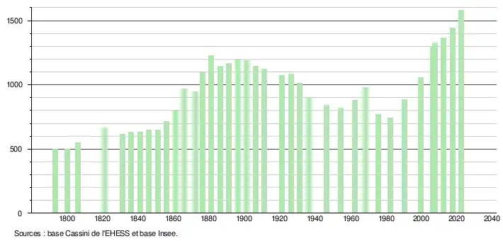| L'évolution du nombre d'habitants est connue à travers les recensements de la population effectués dans la commune depuis 1793. Pour les communes de moins de 10 000 habitants, une enquête de recensement portant sur toute la population est réalisée tous les cinq ans, les populations de référence des années intermédiaires étant quant à elles estimées par interpolation ou extrapolation[27]. Pour la commune, le premier recensement exhaustif entrant dans le cadre du nouveau dispositif a été réalisé en 2007[28]. En 2022, la commune comptait 1 579 habitants[Note 2], en évolution de +11,99 % par rapport à 2016 (Aude : +2,65 %, France hors Mayotte : +2,11 %). |
