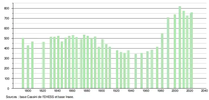 L'évolution du nombre d'habitants est connue à travers les recensements de la population effectués dans la commune depuis 1793. Pour les communes de moins de 10 000 habitants, une enquête de recensement portant sur toute la population est réalisée tous les cinq ans, les populations de référence des années intermédiaires étant quant à elles estimées par interpolation ou extrapolation[49]. Pour la commune, le premier recensement exhaustif entrant dans le cadre du nouveau dispositif a été réalisé en 2006[50].