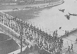 Elle oppose douze équipes (six pour chaque partie de la cité) de vingt joueurs, qui doivent pousser un chariot de sept tonnes, posé sur des rails, jusqu'aux limites du pont du côté adverse.