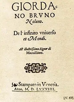 Filippo Bruno dit Giordano Bruno, né en à Nola (Royaume de Sicile) et mort le à Rome, est un frère dominicain, théologien, philosophe[1],[2],[3],[4], mathématicien, astronome et occultiste napolitain. Poursuivant les travaux de Nicolas de Cues et de Nicolas Copernic, il développe une théorie de l'héliocentrisme et tente de démontrer, de manière philosophique, l'existence d'un univers infini dépourvu de centre comme de circonférence[note 1], peuplé d'une « quantité innombrable d'astres et de mondes identiques au nôtre ».