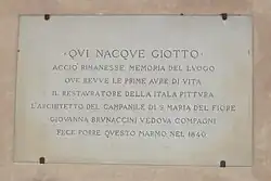 Giotto di Bondone ou Ambrogiotto di Bondone, dit Giotto, né en 1266 ou 1267[1] à Vespignano ou Romignano et mort le à Florence, est un peintre, sculpteur et architecte italien de la République florentine. Artiste majeur du Trecento, ses œuvres sont à l'origine du renouveau de la peinture occidentale. C'est l'influence de sa peinture qui va provoquer le vaste mouvement général de la Renaissance à partir du siècle suivant.