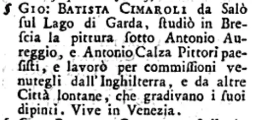 La seconde est une lettre de comte Carl Gustaf Tessin de Suède envoyé de Venise à Stockholm le : il passe en revue les peintres vénitiens les plus connus du moment, et mentionne à propos de Cimaroli, que ses tableaux, à cause de la similitude des thèmes avec les peintures avec de Canaletto, sont tellement appréciés par les collectionneurs anglais, dans l'impossibilité de se procurer des originaux de Canaletto, « que cela fait monter le prix de la plus petite d'un de ses peintures à au moins trente sequins[11] ».