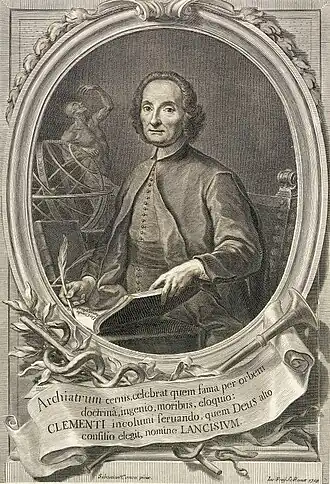 Giovanni Maria Lancisi ( Rome - Rome) est un médecin et clinicien italien de la fin du XVIIe et du début du XVIIIe siècle. Issu de l'université La Sapienza de Rome, Giovanni Maria Lancisi a pu, grâce à l'étude de l’épidémiologie et de l’anatomie, établir une corrélation entre la présence des moustiques et la prédominance de la malaria. C’est lui qui introduisit le mot mal’aria, « mauvais air ». Il est également connu pour ses études sur les maladies cardiovasculaires. Il fut le médecin (« archiatre ») du pape Clément XI. Il publia, commentaires à l'appui, Anatomia per uso et Intelligenza del disegno basées sur les préparations anatomiques de Bernardino Genga. Il entra comme médecin à l'arcispedale Santo Spirito in Saxia à Rome. Ses travaux ont été remarquables dans l'étude des anévrismes artériels, de leurs causes et de leurs conséquences. Il décrivit l’insuffisance tricuspide et l’insuffisance cardiaque droite ainsi que l'angine de poitrine. Il eut pour élève Giovanni Cosimo Bonomo, avec qui il a été en désaccord par la suite sur le lien entre son observation d'un acarien et la gale. Responsable en titre de l'édition de la Metallotheca de Michele Mercati, il délégua ce travail à son disciple et ami Pietro Assalti.