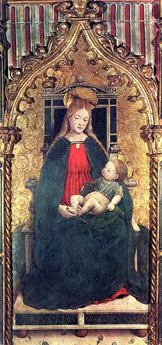 - la Vierge entre saint Sébastien et saint Ubald (v. 1480-1490) triptyque, Galerie Sabauda (Turin).