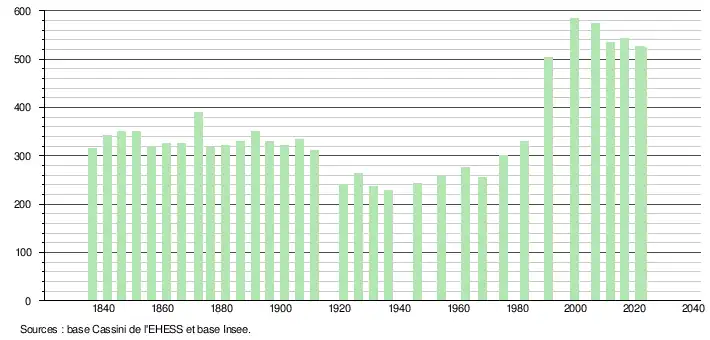 L'évolution du nombre d'habitants est connue à travers les recensements de la population effectués dans la commune depuis 1836. Pour les communes de moins de 10 000 habitants, une enquête de recensement portant sur toute la population est réalisée tous les cinq ans, les populations de référence des années intermédiaires étant quant à elles estimées par interpolation ou extrapolation[16]. Pour la commune, le premier recensement exhaustif entrant dans le cadre du nouveau dispositif a été réalisé en 2006[17].