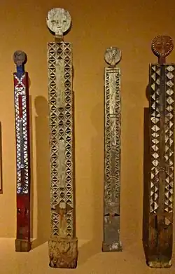 Chez eux chaque clan dispose de son propre lieu de culte, le kaya, qui abrite aussi les esprits des ancêtres et constitue un véritable centre de la vie politico-religieuse[5]. À leur mort les notables du kaya ont droit à l'élévation d'un poteau protégé par une petite hutte et qui fait l'objet d'offrandes. Ces poteaux sculptés sont plats et divisés en plusieurs sections symétriques contenant des motifs variés, principalement des triangles et des losanges. Les têtes sont stylisées, ce ne sont jamais les portraits des défunts. Elles peuvent comporter yeux, nez, menton, parfois une bouche, mais rarement des oreilles. Leurs silhouettes longilignes et leur expression hautaine confèrent à ces poteaux dignité et solennité, empreintes de tristesse.