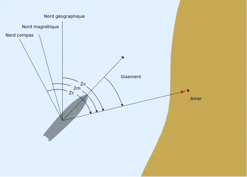 Elle est surtout utile pour indiquer ou repérer le "progrès" d'un obstacle ou d'un amer (afin d'avoir par exemple une idée de l'influence de la dérive ou du courant), d'une cible ou d'un autre mobile (en particulier pour la détermination de l'existence d'un risque de collision avec un autre navire). Lors des quarts à la mer, le matelot de veille exprime le gisement en quart de la façon suivante : Feu à 2 quarts bâbord lorsqu'il observe un feu sur l'horizon du côté bâbord à approximativement 20° en gisement.