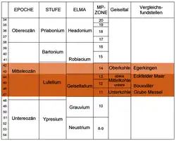 Pour une détermination précise de l'âge du lignite du Geiseltal, les restes de la faune sont importants, en particulier ceux des mammifères, qui permettent une comparaison avec d'autres gisements fossillifères et des conclusions. Cette détermination de l'âge biostratigraphique est largement définie par les modifications de la morphologie des dents de groupes bien définis de mammifères, ce qui permet de déduire la présence dans le temps d'espèces et de genres maintenant disparus. Les premiers fossiles de vertébrés découverts au début du XXe siècle, des restes de dents du parent du tapir, le lophiodon, ont permis l'insertion du lignite dans l'époque géologique de l'éocène moyen. C'est ainsi que l'on a pu déterminer avec précision l'âge relatif des lignites, qui n'avait jusque là été que supposée[96]. L'éocène moyen a un âge de 47,8 à 41,3 millions d'années et est composé d'une couche inférieure, le lutetium et d'une couche supérieure, le bartonium. Par la présence de certaines formes de mammifères, l'âge précis du lignite du Geiseltal peut être assez précisément déterminé. On place ainsi les riches fossiles du filon inférieur jusqu'au filon moyen supérieur dans la zone du geiseltalium, une période au sein de la stratigraphie des mammifères terrestres européens (European Land Mammal Ages, ELMA). La faune du Geiseltal sert de référence pour le geiseltalium, qui forme un segment moyen du lutetium. Les quelques fossiles du niveau supérieur sont placés dans une zone plus récente, le robiacium. Le début du geiseltalium va ainsi de l'apparition des formes précoces du cheval primitif propalaeotherium, mais aussi de son parent le lophiotherium, ou du primate europolemur, tandis que sa fin est indiquée par la première apparition de primates comme l'adapis[14],[97].