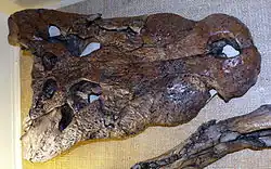 Les crocodiles sont également nombreux, avec 120 squelettes complets, plus de nombreux os et dents isolés. Allognathosuchus y représente les alligators. Il atteint 2 mètres et possède un museau très étroit. Diplocynodon fait partie des formes les plus nombreuses de crocodiles dans le Geiseltal et on le range dans la famille éteinte des Leidyosuchidae. Il vivait dans de petites étendues d'eau, tout en atteignant bien 2,5 mètres de long. Boverisuchus était à peu près aussi grand et nombreux, mais il représentait les vrais crocodiles. En raison des phalanges terminales de ses doigts élargies en sabot, on suppose que ce crocodile avait un mode de vie plutôt terrestre. Le plus grand prédateur du Geiseltal était Asiatosuchus, dont la longueur du corps atteignait 5 mètres. Écologiquement, il ressemblait au crocodile du Nil actuel et préférait les eaux ouvertes. On en a trouvé de nombreux squelettes complets. Par contre, Bergisuchus, dont l'holotype a été découvert sur le site fossilifère de Messel, n'apparaît que très rarement sous forme de quelques fragments de mandibule. C'était aussi probablement un crocodile plutôt terrestre, de petite taille avec sa longueur de 1,5 m[46]. Des recherches détaillées ont conclu que tous les crocodiles du Geiseltal occupaient des niches écologiques différentes[47]. En outre, on a trouvé des fragments d'œufs de crocodiles[48] et de nombreux gastrolithes ou pierres d'estomac, qui attestent même en l'absence de fossiles la présence des crocodiles[3].