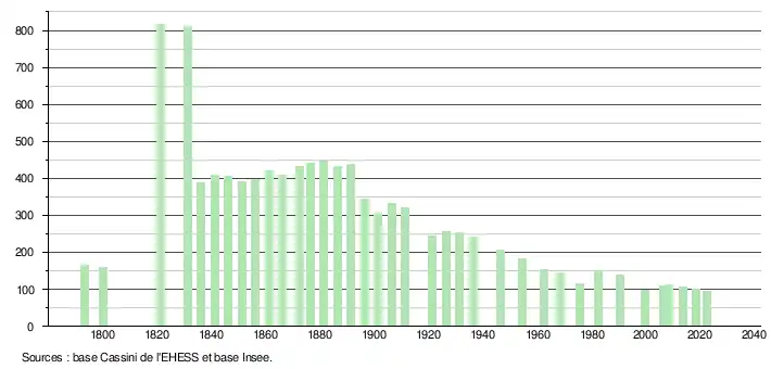 L'évolution du nombre d'habitants est connue à travers les recensements de la population effectués dans la commune depuis 1793. Pour les communes de moins de 10 000 habitants, une enquête de recensement portant sur toute la population est réalisée tous les cinq ans, les populations de référence des années intermédiaires étant quant à elles estimées par interpolation ou extrapolation[43]. Pour la commune, le premier recensement exhaustif entrant dans le cadre du nouveau dispositif a été réalisé en 2008[44].