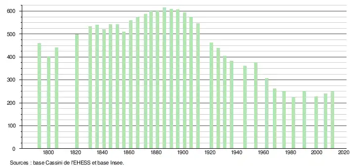 L'évolution du nombre d'habitants est connue à travers les recensements de la population effectués dans la commune depuis 1793. À partir du , les populations légales des communes sont publiées annuellement dans le cadre d'un recensement qui repose désormais sur une collecte d'information annuelle, concernant successivement tous les territoires communaux au cours d'une période de cinq ans. Pour les communes de moins de 10 000 habitants, une enquête de recensement portant sur toute la population est réalisée tous les cinq ans, les populations légales des années intermédiaires étant quant à elles estimées par interpolation ou extrapolation[3]. Pour la commune, le premier recensement exhaustif entrant dans le cadre du nouveau dispositif a été réalisé en 2006[4],[Note 1].