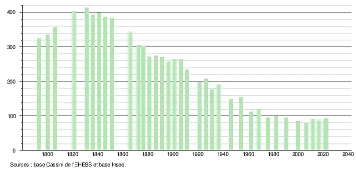 L'évolution du nombre d'habitants est connue à travers les recensements de la population effectués dans la commune depuis 1793. Pour les communes de moins de 10 000 habitants, une enquête de recensement portant sur toute la population est réalisée tous les cinq ans, les populations de référence des années intermédiaires étant quant à elles estimées par interpolation ou extrapolation[20]. Pour la commune, le premier recensement exhaustif entrant dans le cadre du nouveau dispositif a été réalisé en 2006[21].