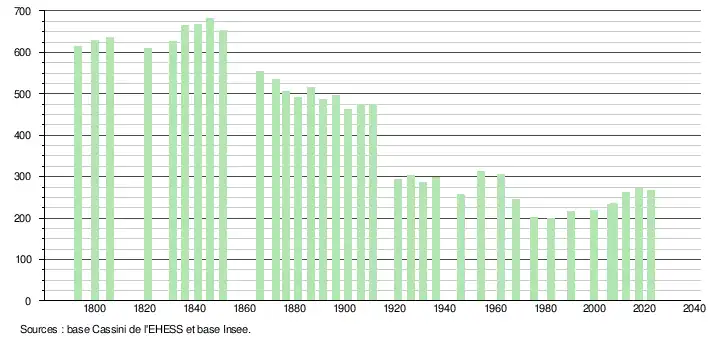 L'évolution du nombre d'habitants est connue à travers les recensements de la population effectués dans la commune depuis 1793. Pour les communes de moins de 10 000 habitants, une enquête de recensement portant sur toute la population est réalisée tous les cinq ans, les populations de référence des années intermédiaires étant quant à elles estimées par interpolation ou extrapolation[23]. Pour la commune, le premier recensement exhaustif entrant dans le cadre du nouveau dispositif a été réalisé en 2007[24].