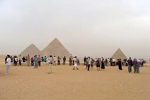 Haut lieu touristique grâce à la présence des pyramides, dont celle de Khéops qui reste classée parmi les Sept Merveilles du monde depuis l'Antiquité, le site de Gizeh est menacé par la rapide expansion du Caire dont l'urbanisation importante et peu contrôlée grignote peu à peu les alentours du site y compris sur le désert.