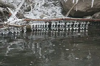 - ↑ L'éclatement d'un récipient suffisamment rempli initialement d'eau liquide, par exemple une bouteille en verre, s'observe lors de la congélation de l'eau en glace.