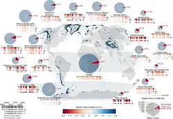 D'après une étude pluridisciplinaire publiée dans Nature en 2025[21], entre 2000 et 2023, les glaciers du monde entier ont perdu 273 gigatonnes de masse par an, avec une augmentation de 36 % entre la première (2000-2011) et la seconde (2012-2023) moitié de la période. Cette fonte est très disparate selon les régions, avec un écart type de 2 % à 39 % de perte de glace et une moyenne de 5 % environ au niveau mondial. Ainsi, les régions les plus fortement concernées sont les Alpes et les Pyrénées avec une fonte de 39 % de la masse de leurs glaciers, le Caucase avec 35 %, la Nouvelle Zélande avec 29 %, la Sibérie avec 23 % et l'Asie du Sud-Est avec 21 % alors que la fonte de l'Arctique canadien et de l'Antarctique ne représentent respectivement que 3 % et 1,5 % de la masse totale de leurs glaciers. Durant ce quasi quart de siècle, les années 2022 et 2023 font figure de record.