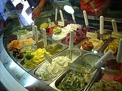 Le Gelato est un type de crème glacée italienne contenant plus de lait et moins de crème que la crème glacée américaine. Le sorbet est une friandise glacée à base de fruits, de sirop et de glace. Il ne contient ni lait ni crème. Le yaourt glacé est une alternative courante à la crème glacée, faible en matière grasse, avec une texture onctueuse similaire à celle de la crème glacée molle. Tous ces produits glacés peuvent être vendus en cornet à glaces, gobelets, sundaes et milkshakes. Certains glaciers peuvent également vendre des gâteau glacés, des barres glacées et d'autres friandises glacées préemballées. En plus des produits de dessert glacé, certains glaciers modernes vendent également une variété de plats chauds de restauration rapide[réf. nécessaire].