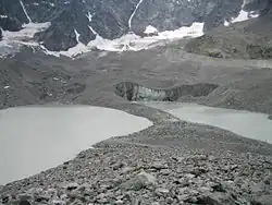 - Moraine frontale du glacier, vue des environs du col d'Arsine, en contrebas, en juillet 2006.
