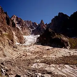 Le glacier de la Charpoua dominé par les Drus. | |||