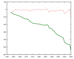Évolution du glacier en mètres. En vert, les différences de longueur cumulées. En rouge, les variations de longueur annuelles.
