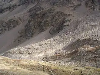 - une couche de débris rocheux libres de glace enfouis sous le glacier rocheux au fur et à mesure de son avancée.