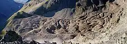 - la présence de sillons longitudinaux dans les secteurs en étirement (forte pente), et de rides et sillons transversaux dans les secteurs de ralentissement de l'écoulement. Ces dernières formes, aussi appelées bourrelets, ont une amplitude de quelques décimètres à quelques mètres et sont particulièrement visibles sur la partie terminale du glacier rocheux.
