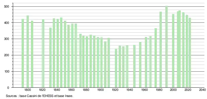 L'évolution du nombre d'habitants est connue à travers les recensements de la population effectués dans la commune depuis 1793. Pour les communes de moins de 10 000 habitants, une enquête de recensement portant sur toute la population est réalisée tous les cinq ans, les populations de référence des années intermédiaires étant quant à elles estimées par interpolation ou extrapolation[30]. Pour la commune, le premier recensement exhaustif entrant dans le cadre du nouveau dispositif a été réalisé en 2008[31].
