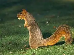 - ↑ Deux grandes catégories de stratégies de stockage de nourriture sont observées : l'amassage centralisé (« larder hoarding ») qui vise à entreposer l'ensemble des graines collectées dans un unique grenier central qui peut être le terrier. L'amassage dispersé ou amassage par thésaurisation (« scatter hoarding ») qui vise à répartir ces réserves dans de petites caches largement dispersées. Ces deux stratégies sont l'expression de compromis évolutifs entre différents traits biologiques : coûts énergétiques de collecte et de manipulation, positionnement des caches pour minimiser les risques de pillage par des compétiteurs (le taux de chapardage pouvant s'élever de 2 à 30 % par jour)[11],[12].
