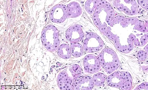 - ↑ (en) Anne M. Mills, Chelsea E. Gottlieb, Scott M. Wendroth et Christiana M. Brenin, « Pure Apocrine Carcinomas Represent a Clinicopathologically Distinct Androgen Receptor–Positive Subset of Triple-Negative Breast Cancers: », The American Journal of Surgical Pathology, vol. 40, no 8, , p. 1109–1116 (ISSN 0147-5185, DOI 10.1097/PAS.0000000000000671, lire en ligne, consulté le )