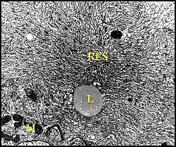 D’autre part, les cellules sécrétrices possèdent un noyau basal et sont toujours pleines de boules de sécrétion bien individualisées (3 μm). Leur chondriome est très peu développé. De plus, la pièce terminale est inexistante, la lumière est mince et se continue par celle d’un conduit constitué de chitine (polysaccharide azoté, principal constituant de la cuticule des Insectes normalement)[14].