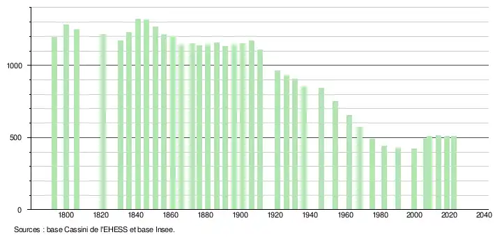 L'évolution du nombre d'habitants est connue à travers les recensements de la population effectués dans la commune depuis 1793. Pour les communes de moins de 10 000 habitants, une enquête de recensement portant sur toute la population est réalisée tous les cinq ans, les populations de référence des années intermédiaires étant quant à elles estimées par interpolation ou extrapolation[21]. Pour la commune, le premier recensement exhaustif entrant dans le cadre du nouveau dispositif a été réalisé en 2008[22].