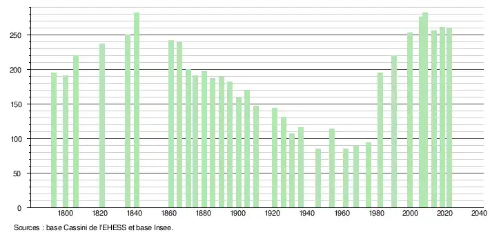 L'évolution du nombre d'habitants est connue à travers les recensements de la population effectués dans la commune depuis 1793. Pour les communes de moins de 10 000 habitants, une enquête de recensement portant sur toute la population est réalisée tous les cinq ans, les populations de référence des années intermédiaires étant quant à elles estimées par interpolation ou extrapolation[32]. Pour la commune, le premier recensement exhaustif entrant dans le cadre du nouveau dispositif a été réalisé en 2008[33].