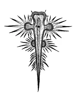 Dessin de détail du pénis, armé de son crochet corné, par Bergh (1888).