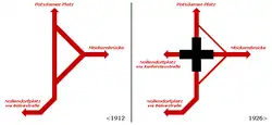 La nouvelle station Gleisdreieck a été construite courant 1912 / 1913. Elle a été construite en hauteur entre de nombreuses grandes lignes de chemin de fer : la ligne de Berlin à Halle, la ligne de Berlin à Dresde, la ligne de Berlin à Magdebourg et la ligne du Wannsee. Il faut attendre 1926 pour que la station prenne sa forme actuelle à deux étages, empruntés par deux lignes qui circulent en parallèle jusqu(à Nollendorfplatz.